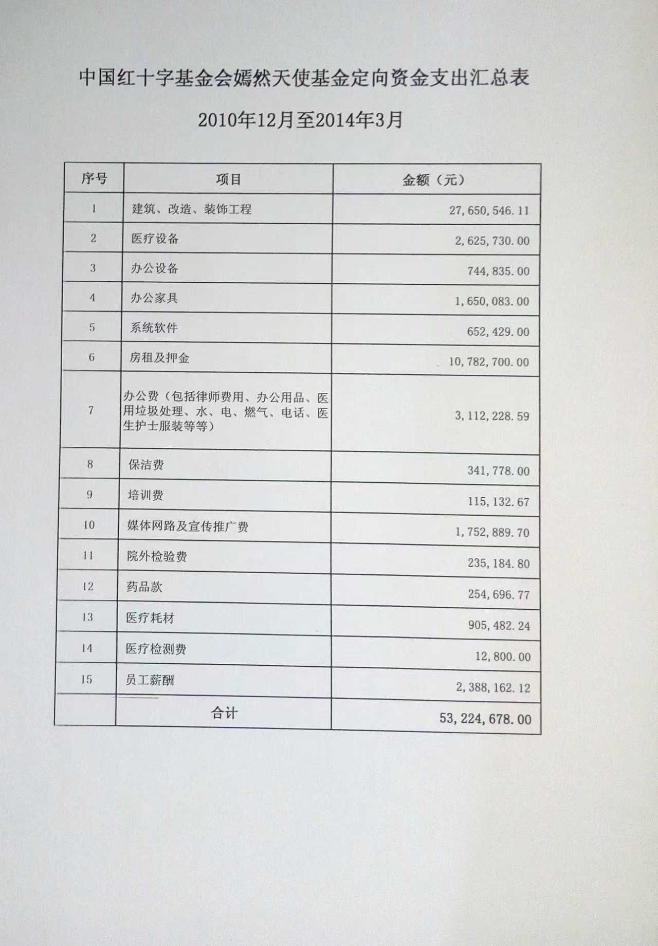 审计报告-嫣然天使医院前置拨款说明周姓记者申请民政部公开的审计报告中的《中国红十字基金会嫣然天使基金定向资金支出汇总表(2010年12月至2014年3月)》显示,在拨付给嫣然天使儿童医院的53,224,678.00元中,名列前三的支出分别是:建筑、改造、装饰工程费用27,650,546.11元;房租及押金10,782,700.00元;医疗设备2,625,730.00元。