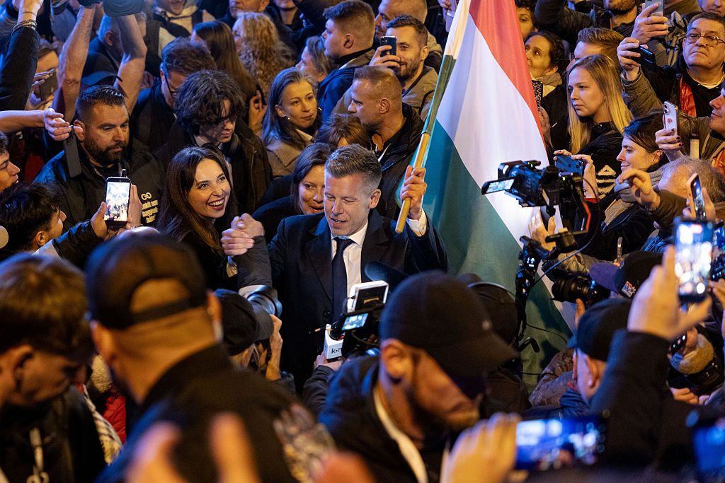 4月12日,匈牙利的蒂萨党在议会选举中获胜,该党领导人毛焦尔•彼得在布达佩斯向支持者致意。图片:GettyImages3
